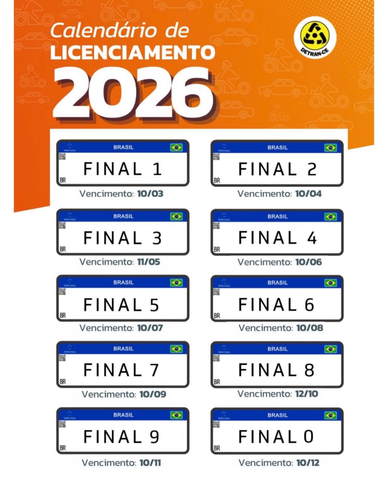 O Departamento Estadual de Trânsito do Ceará (Detran-CE) disponibilizou o calendário de licenciamento de veículos para o exercício de 2026. O cronograma é definido de acordo com o número final da placa do veículo. Os extratos podem ser emitidos pelo aplicativo Meu Detran, pelo site oficial (www.detran.ce.gov.br) ou na Central de Serviços, com a facilidade do pagamento instantâneo via Pix. (Veja calendário abaixo)