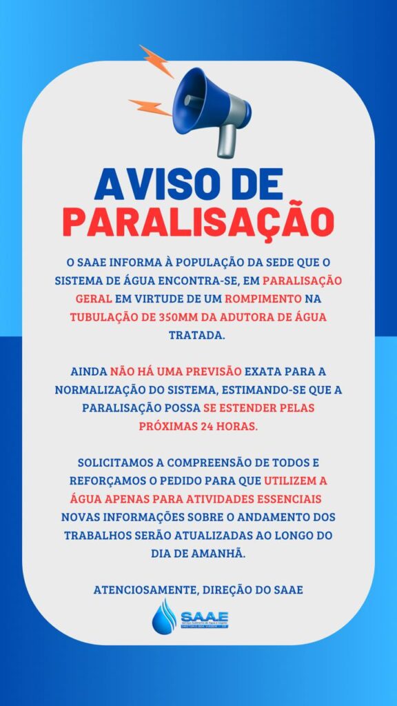 O SAAE emitiu uma nota de esclarecimento, informando a paralização do abastecimento enquanto é resolvido o problema.