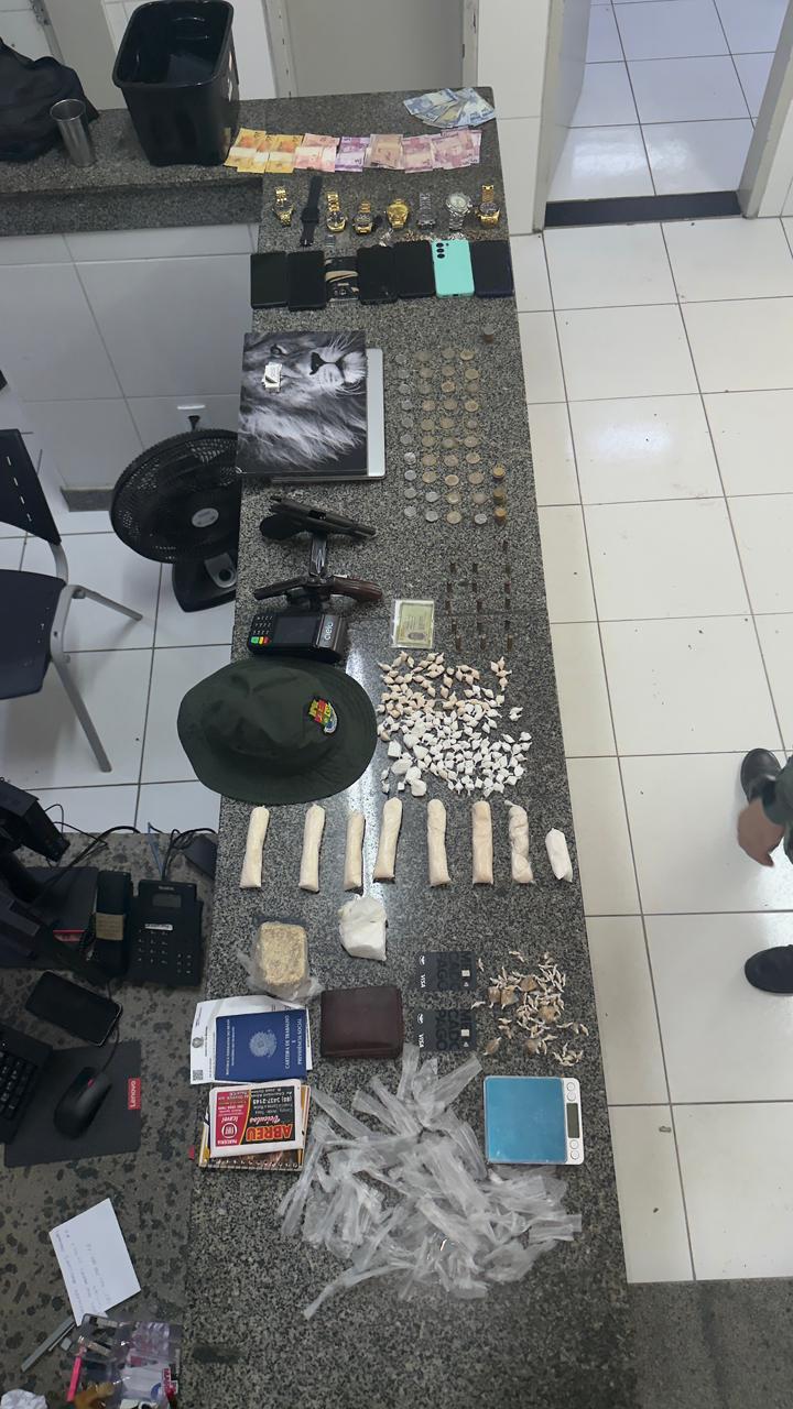 Nas buscas realizadas no imóvel, os policiais militares encontraram um revólver calibre .38 com três munições intactas e numeração suprimida, além de uma pistola calibre .380 com um carregador e 13 munições intactas. Também foram apreendidos 264 gramas de substância análoga a crack e 630 gramas de substância análoga a cocaína, além de diversos materiais relacionados à comercialização de entorpecentes, como balança de precisão, embalagens plásticas, aparelhos celulares, quantia em dinheiro, relógios, cartões bancários, máquina de cartão, caderneta de anotações e equipamentos eletrônicos.