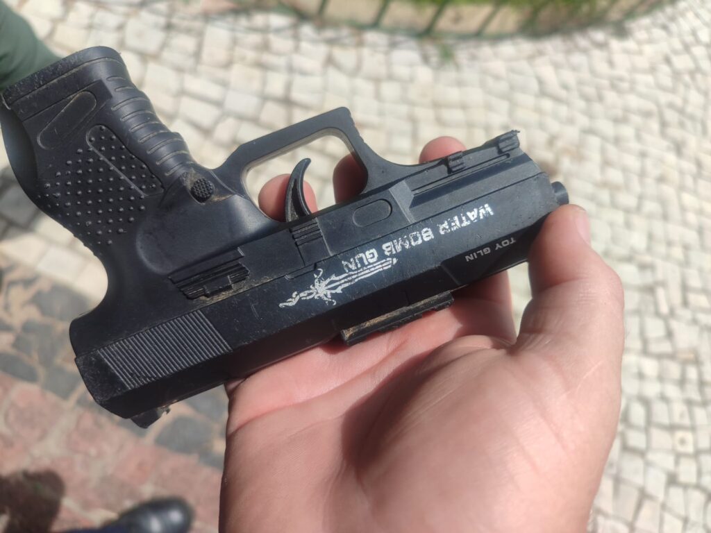 Ao perceber a presença das forças de segurança, o indivíduo tentou se desfazer de um objeto, arremessando-o sobre plantas próximas. Um dos policiais realizou a coleta do objeto, constatando tratar-se de um simulacro de pistola.